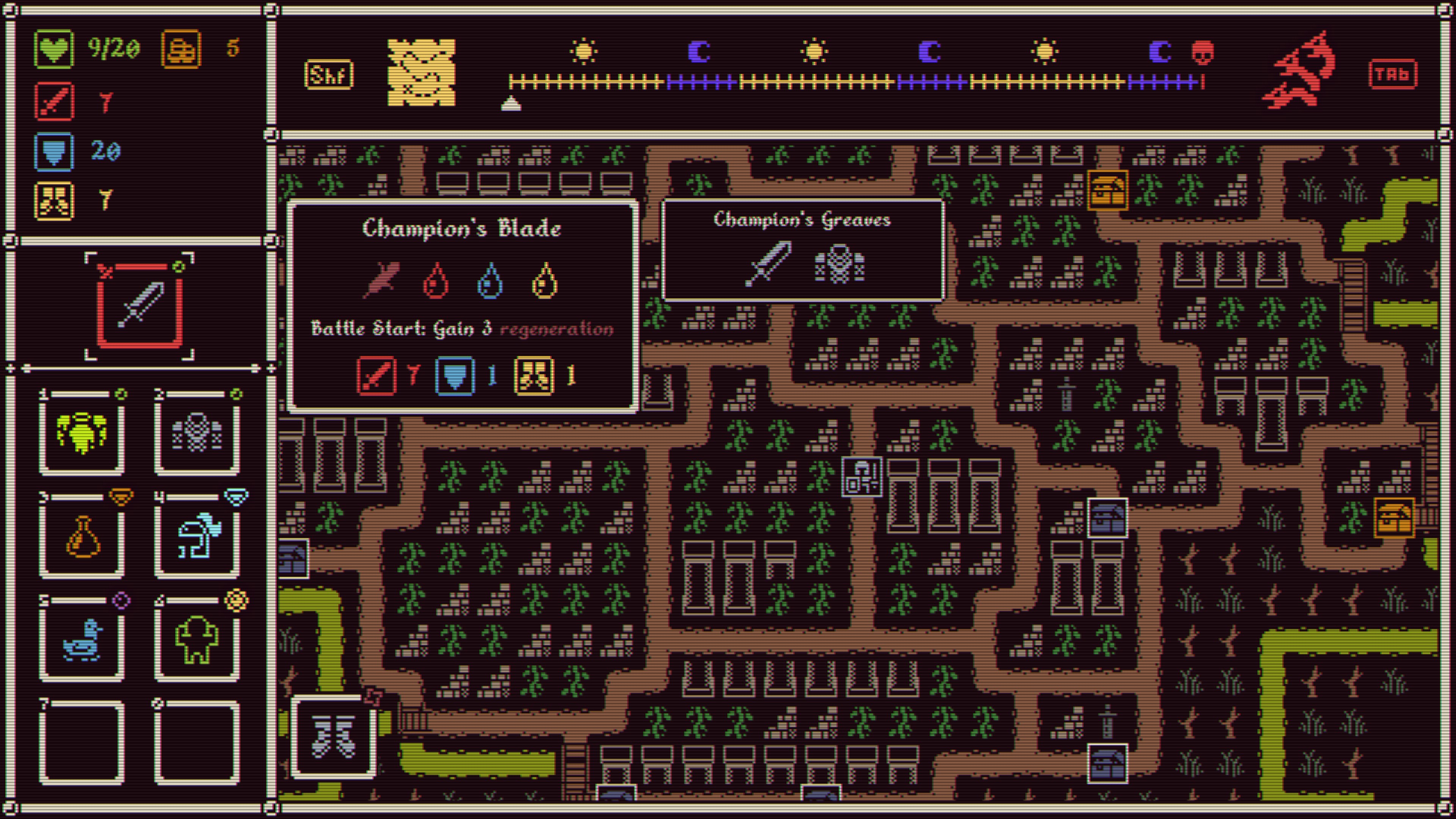 The gameplay isn't quite there yet: you've got a set number of steps to cover the land and scrounge up suitably-powerful equipment before HE comes, with combat handled via Loop Hero autobattles. (Like in Loop Hero, there are a number of loadout approaches you can take, which expand map by map.) Success yields subsequent rounds of stat escalation with a succession of HEs before the headliner HE deigns to descend. The game needs more bite and more to do during levels, though, as you'll see all the equipment and make your necessary choices fairly quickly. It's getting there. It's not *quite* there yet. I wouldn't recommended it at this stage, but I am rooting for it.