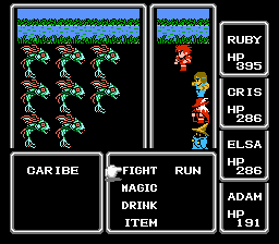 This hadn't posed a problem previously, but the two major dungeons in the Fire Fiend portion of the game, the Gurgu Volcano and the Ice Cave (which leads, eventually, to the airship and the advised sequence-breaking), are each accessed by paddling via canoe from Crescent Lake base camp down little mazes of riverways infested with encounters with Caribes: these fish/shrimp enemies that seem always to go first and always come in plagues of six or so. Final Fantasy has had a problem with tedious encounters previously, but combined with the waterway mazes and the amount of doubling back you have to do, it makes just getting to either dungeon a huge pain-in-the-ass undertaking.