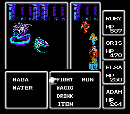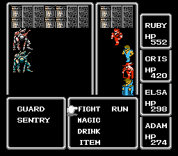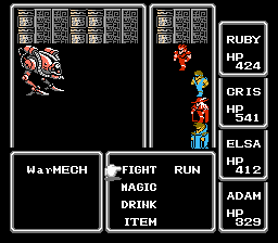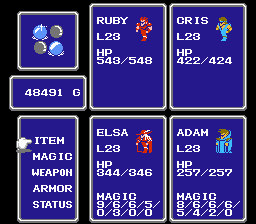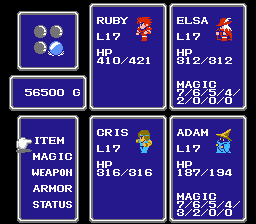 Red Mage: For the first third of the game, my Red Mage was a backup Fighter, doing just a bit less damage in exchange for magic abilities. Here, her damage drops like a brick - she'd been a second Fighter until this stretch, and now she was doing half his damage or less. Her magic wasn't compensating: it doesn't heal enough to be a major source of healing - but, meager as it is, you'd rather put the charges toward HP recovery than offensive spells that don't do much more than a basic attack. She also stops getting high-level armor, losing her defensive edge as well as her offensive. This feels like an intentional nerf than a gradual diminishment of returns on a minmaxxing character, but either way, she never got back her previous usefulness - instead of a jack of all trades, the emphasis was on "master of none."