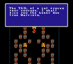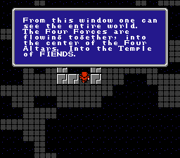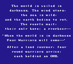 - In fact, I'll say this here: the game text is quite well-written - and for the era, it's practically Shakespeare. The NPCs are all lively and well-characterized in a single window of dialogue; the jokes are cute (the famous well bit; the "No! That is only a useless sample" is you try to "acquire" decorative swords at a blacksmith's) and even witty. Pieces meant to be tone-setting or epic - the intro; the "roll credits" as you cross the Corneria bridge - largely succeed. The text introductions of the Fiends emerging for battle, that describe them feature by horrible feature as they materialize out of billowing smoke, really do set the stakes and a sense of drama for the looming battle. It's all evocative, which is light-years beyond what you can say for most NES prose.