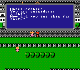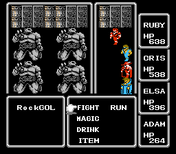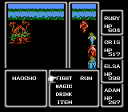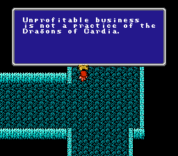 Another instance of gradual difficulty increases: Melmond, the town near the Earth Cave, has no item shop (presumably due to vampire attacks—there's no clinic either), but it's a straight shot east to Coneria, the starting town, from the town's port. They will make things harder for you, but help/offsets are made readily available. - Swings & Roundabouts: A moment of pure triumph as my Black Mage felled the fearsome Vampire with a single shot of Fire 3 (more effective than a bureau!) was immediately offset when, on my way to check out the Plate what needed the ROD in back, my Fighter instantly got petrified by a Cockatrice, and I'd neglected to buy any Soft potions. Man, was that a tense march up three levels of dungeon and back to town. (I'd picked up WARP, but my Black Mage used my his one shot of Level 5 magic in FIR3ing the Vampire.)