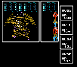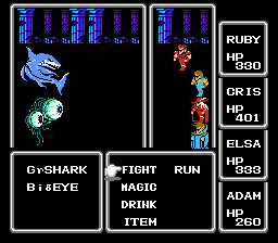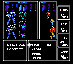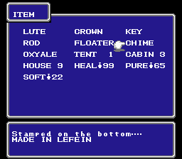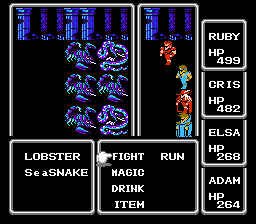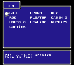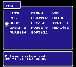 Anyhow: I completely forgot about the CUBE dungeon, as well as the CHIME tower dungeon - as well as the Lefein village itself, actually. (I was completely surprised to see it on the map and wondered what the heck it was, this "new" town completely unknown, I thought, to me, until I parked the airship and hoofed it in - memory had completely erased it from the quest itinerary.) Honestly, late-game Final Fantasy condenses - the last two Fiends, though representing nominally 50% of the quest, feel like a single, fractional stretch of the game. It's in part due to the aforementioned structure of the world map here, but it's also due to other aspects of the game changing, fading from relevance, due to your party's increased capabilities. The items you find in the Sea Shrine that can be used in battle for free spells (namely, the Zeus Gauntlet and LIT2) up your offensive capacity significantly. You just get stronger overall. Money ceases to be an issue, as your rate of earning it far outstrips your rate of spending it, and there's nothing left to buy - you'll probably hit the cap early in this stretch. Also at its limit: your inventory. Some of the party members use only one or two of their equipment slots, but the additional resource of a spellcasting item really puts the squeeze on those sixteen slots. Having to quit out of the Sea Shrine and subsequent dungeons repeatedly mid-looting every couple floors to sell your excess stuff is a very real frustration.