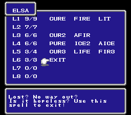 I decided in my playthrough to go only by info in my memory - no looking up spells to see what they did (even though that info was available from the start for NES gamers via the manual). I tried not to grind, but I did at a couple points stop to get up enough cash for some useful equipment. (This worked just fine; grinding actually isn't necessary.)