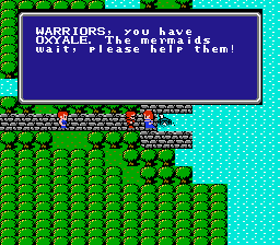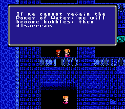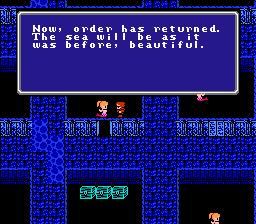 There's not much to this section. I like the Sea Shrine. I like the numerous pretty, deep shades of blue used to communicate your journey into the depths, and the ancient temple aesthetic. I like the pretty, alliterative name. I like the presence of the mermaids to whom you can talk, the presence of friendly NPCs in this separate, forgotten place, and the whole subplot about them fearing the odd yet thematic fate of being transformed into bubbles with the ruin of their habitat. I like that you can revisit them after the fiend's defeat ("Now, the sea will be as it was before, beautiful,") and the little touch of the mermaid wondering about her friend who vanished after seeking legs - whom you can find in Onrac, marveling at her newfound legs. (She's named "Dar[r]yl," appropriately.) The place manages to communicate a sense of danger, mystery, separateness, charm, and beauty using squat 8-bit NES graphics. It's my favorite place in the game.