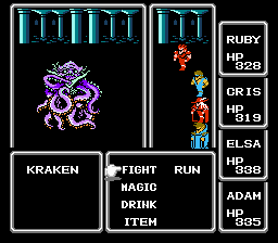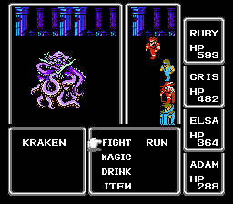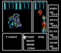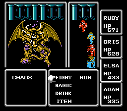 I regret to say that I did not take notes on the Temple of Fiends. I did it all in the first run, I believe. It was time to bring the game to an end. Healing was tight - the Red Mage's healing was limited in more ways than one, so I relied on potions, and some artificial prolonging of battles so that healing equipment could be used item-style. (The in-battle effects of some equipment become vital resources in the endgame, and yet I don't believe you're tutorialized on them - a rare such failure by FF1.) I missed the Masamune - I recalled from my childhood playthroughs it was on Kraken's floor, but resources were already getting scarce by then, so I didn't want to risk the trip it required. I wasn't even able to heal up fully for the Chaos fight, but the RNG gods thankfully blessed me, and I did not hit the turn in his attack cycle where he heals himself to full.