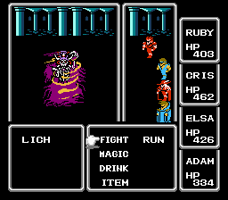 - Written in retrospect: I actually forget exactly how the Lich fight went, but it certainly wasn't hard. I think it actually may have been another instance of FIR3 -> dead (or dead again from undead, or redead, or whatever). The Black Mage is largely dead weight at this stage with his piddling 1DMG attacks, but his very situational uses are very effective. (This will not hold all game; the balance of power gradually shifts from magic to physical attacks.)
